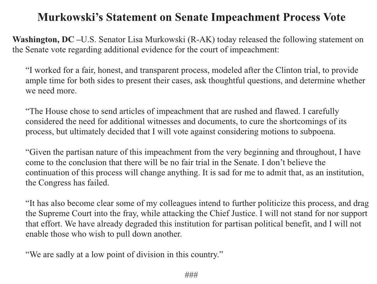 The second-to-last paragraph is interesting. Seems like Murkowski doesn't want a tie vote on the witness question so that nobody has an opportunity to attack Chief Justice Roberts for failing to break the tie.https://twitter.com/sahilkapur/status/1223309804409671691 …