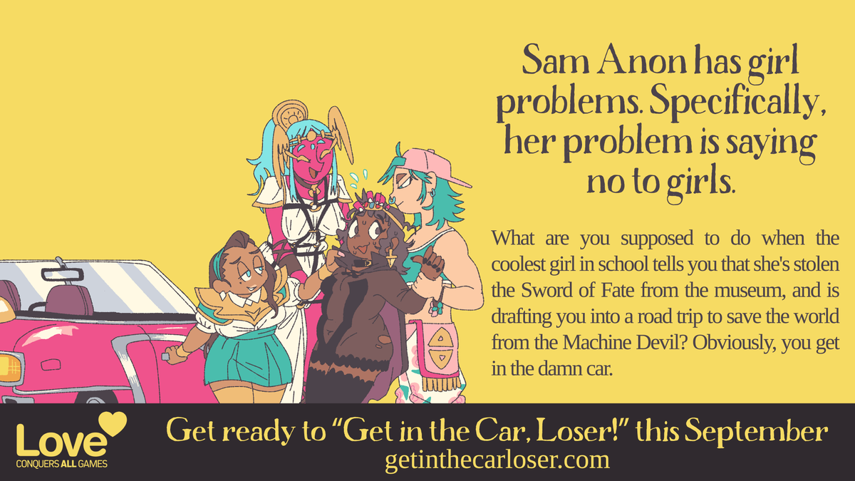 My lesbian road trip RPG "Get in the Car, Loser!" will be coming out this September! Learn more at http://getinthecarloser.com pic.twitter.com/t86OzfwGEp