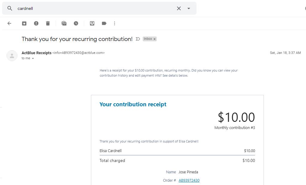 I will be matching donations totalling $1,000 per month until the election. Please donate via ActBlue and send me the receipt. I will post matching donations weekly.