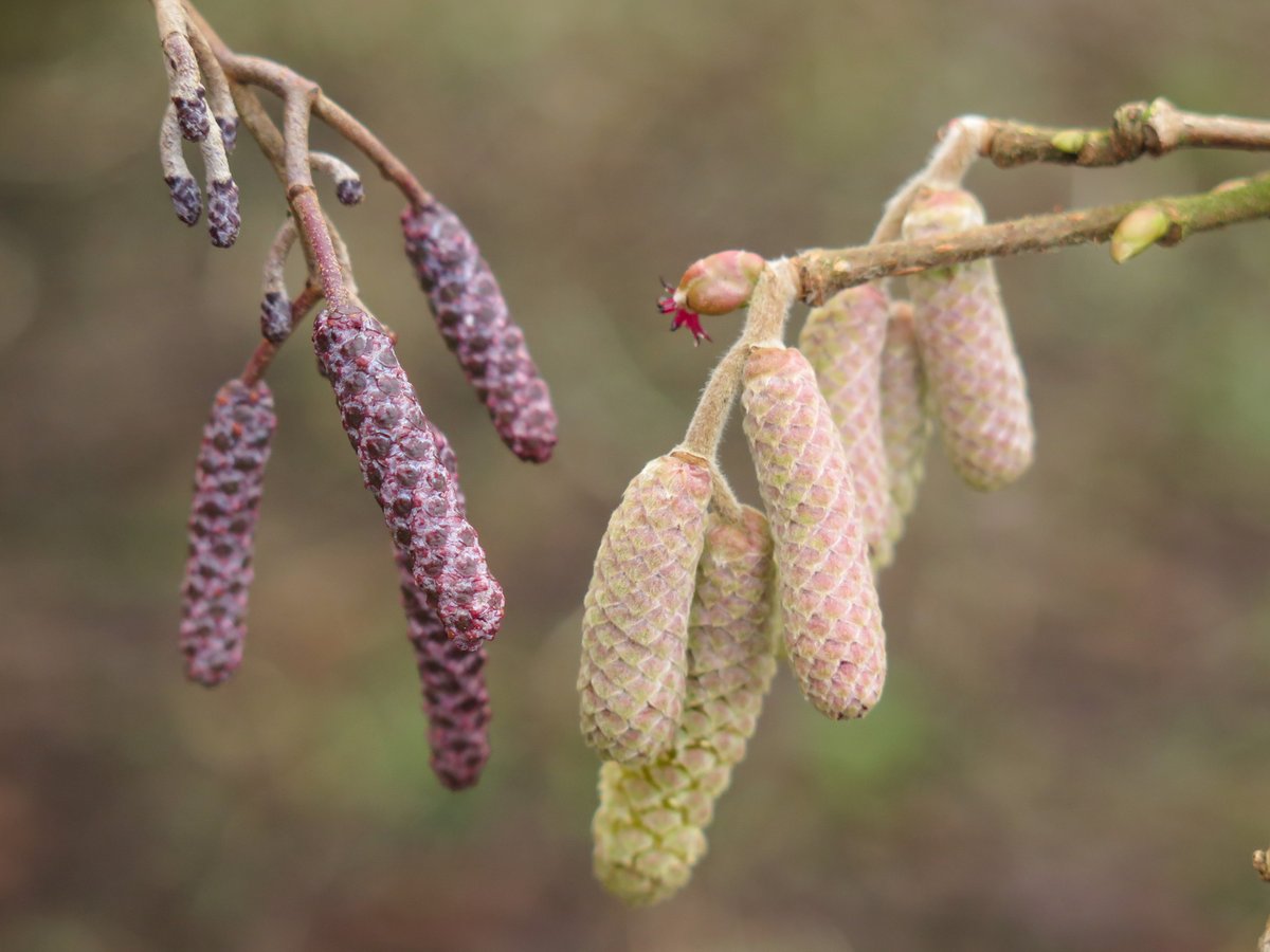 So pleased to find these two shrubs flowering side by side! Hazel on the right with male catkins below & a tiny red female flower on the end bud. Alder on the left with the male catkins below & the smaller female flowers above - these will soon turn into the characteristic conespic.twitter.com/edZ7h6OKvA