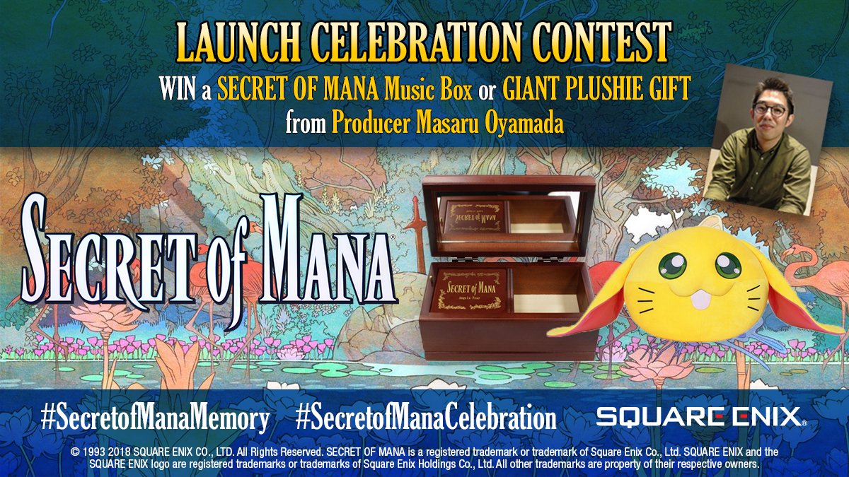 Tell us about a memory you have with #SecretofMana by entering the #SecretofManaMemoryContest for a chance to win a music box or a giant plushie gift from producer Masaru Oyamada. #SecretofManaLove #SecretofManaCelebration Full terms & conditions 🎵🐰: http://bit.ly/2EzstKo pic.twitter.com/2zC3I5lObO