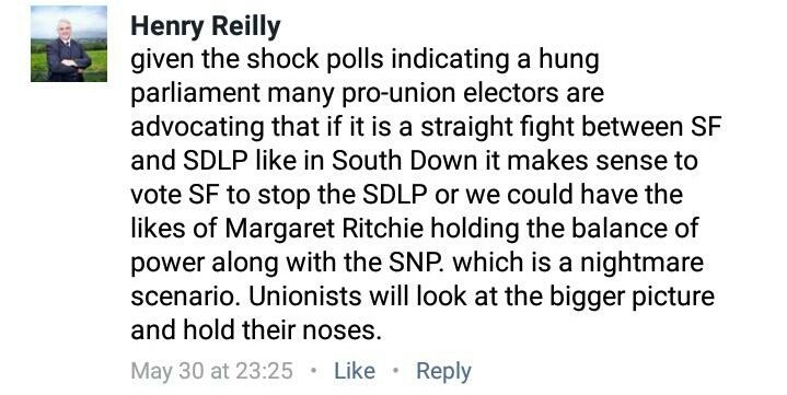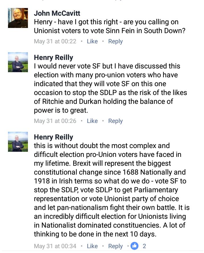 Ex-UKIP now TUV, Henry Reilly wants SF to win in South Down, as an abstentionist MP would give the constituency no voice against Brexit!pic.twitter.com/GeEyqoFGCP