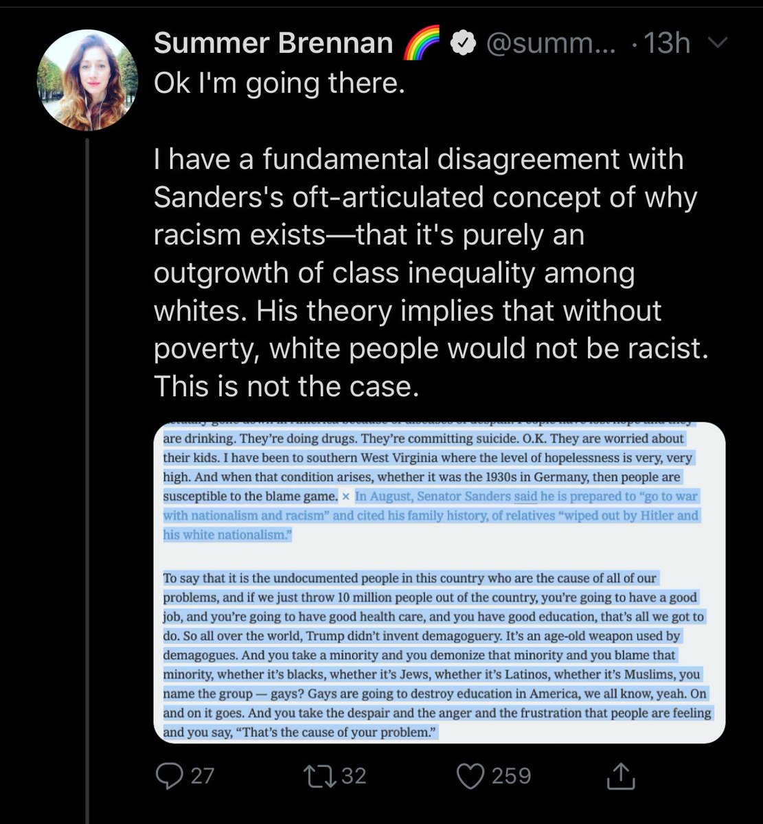 It’s notable how many criticisms of Sanders here rely on an obvious misrepresentation (Racism is caused ONLY by economic anxiety) rather than it exacerbating hostility toward outgroups. It’s also weird how easily people hear the strawman version rather than what he actually said.pic.twitter.com/Ct1nPespJo