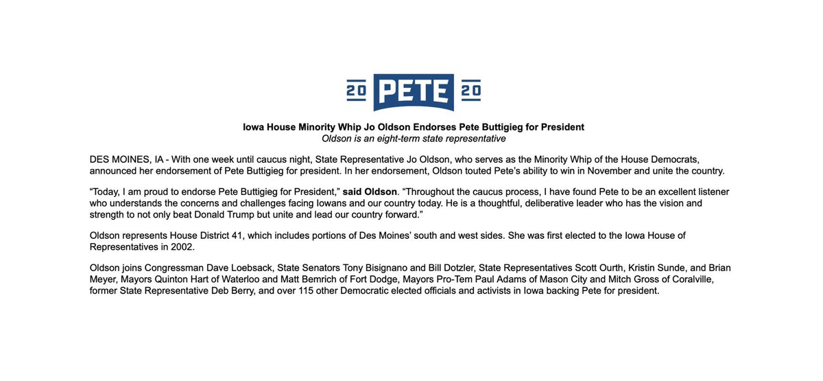 Eight-term State Representative Jo Oldson, who serves as the Minority Whip of the House Democrats, has endorsed @PeteButtigieg. Huge get.pic.twitter.com/iTAyzjiGve
