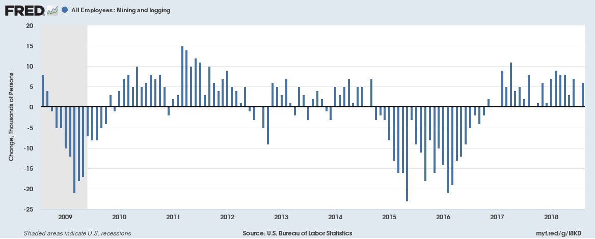 Mining & logging employment has reversed from falling to growing. Feb 2016 was the worst month, when the sector lost 21,000 jobs. The rate of change improved over the whole next year & has been steady or down since about then.pic.twitter.com/DnNAaDL0WU