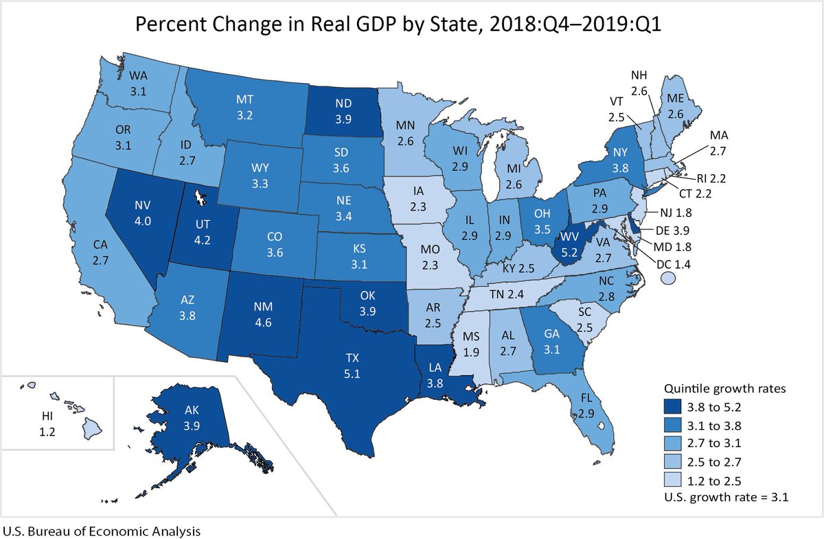 All 50 states grew in the first quarter of 2019, with only 4 states growing less than 2.0%. The U.S. economy is booming thanks to