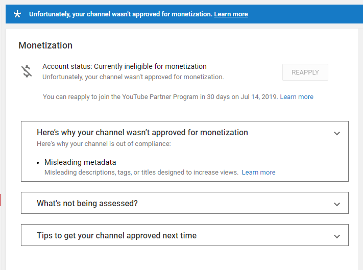 @TeamYouTube Hi, my youtube account https://www.youtube.com/channel/UCiEnxs-E55nshnboceBUjig … … was just demonetized for "Misleading metadata" and I sure this is a mistake!!!. Can I get some help fixing this, or more information on why this happened?pic.twitter.com/goehdSEqet