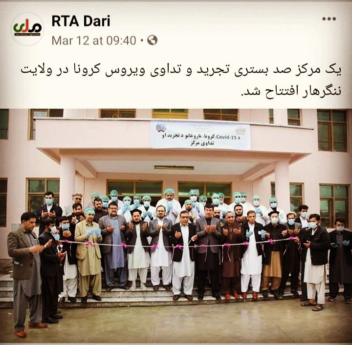 اولین و بیشتر افراد مبتلا به کرونا در هرات اما رادیو تلویزیون اوغانی گزارش داده که حکومت قبیلهی رفته به ننگرهار مرکز اختصاصی کرونا ساخته و کیت ها و بودجه را هم به ننگرهار فرستاده. در حالیکه حتی یک فرد مبتلا بهکرونا هم در ننگرهار نیستpic.twitter.com/WYrM911gzd
