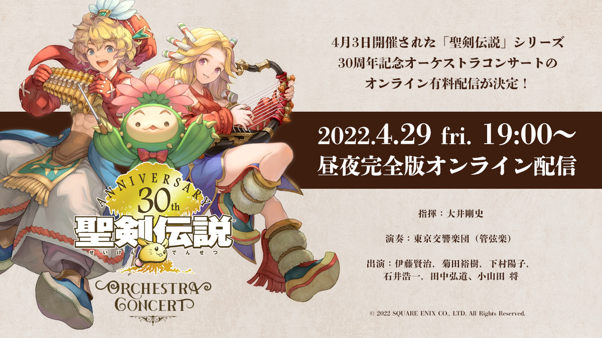 「聖剣伝説」30周年記念コンサートの映像配信が決定。昼夜公演を合わせた完全版として,4月29日19:00から1週間限定配信。特製サーモボトル付き視聴券も販売 https://www.4gamer.net/games/580/G058090/20220408057/ …