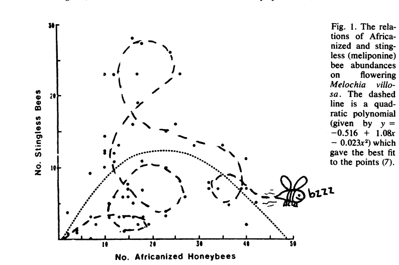 Time to bring out Bob Hazen's satirical old data fitting for bee-visits to flower heads. "The rather fanciful [quadratic] curve fitting of Roubik has prompted me to propose an alternative interpretation of his data (see below)."pic.twitter.com/vEildaBIU8
