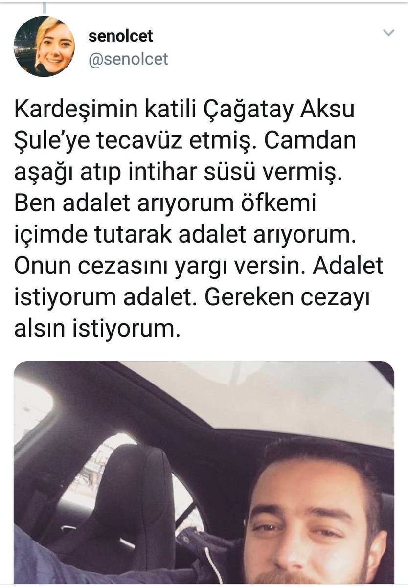 fotoğraftaki kişi Çağatay Aksu, Şule’ye tecavüz edip 20.kattan aşağı atarak intihar etti ifadesiyle hala serbest olan bir sapık. Bütün basın şuleyi gösterirken bu ruh hastasını sansürlüyor daha fazla kadın ölümüne dur demek ve en önemlisi