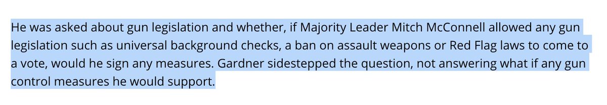 From the article you cite above - this is a notable excerpt. Notable because at each of your "stops" this month you've been asked about both #HR8 & #HR6, indeed been given copies of the bill, yet you still say this #copolitics #Cosen https://twitter.com/SenCoryGardner/status/1163857805222141953?s=20 …pic.twitter.com/924AWjm8Db