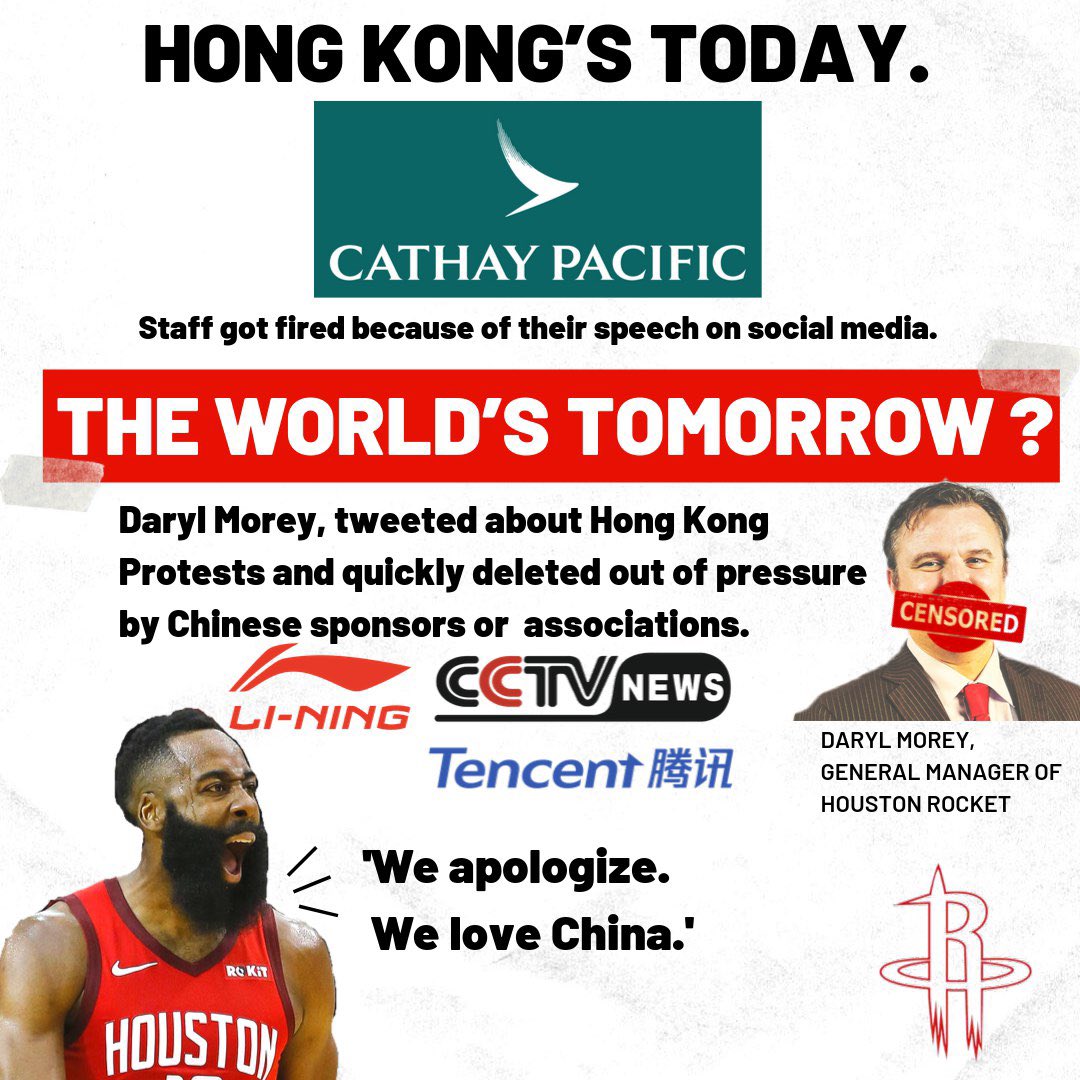 What happened in Hong Kong yesterday is happening in the world today. Freedom of speech is suppressed when you need to earn money from China. Pity worldpic.twitter.com/wg4G7ZcvTD