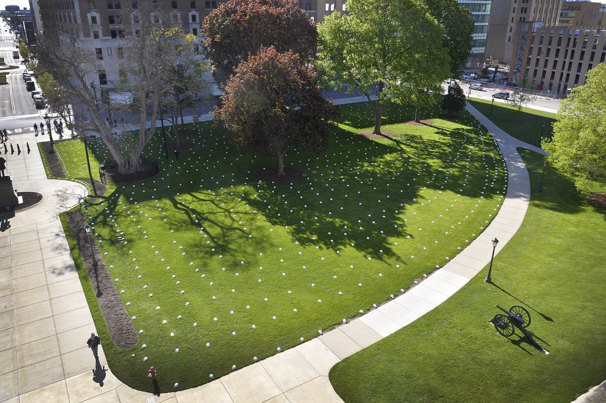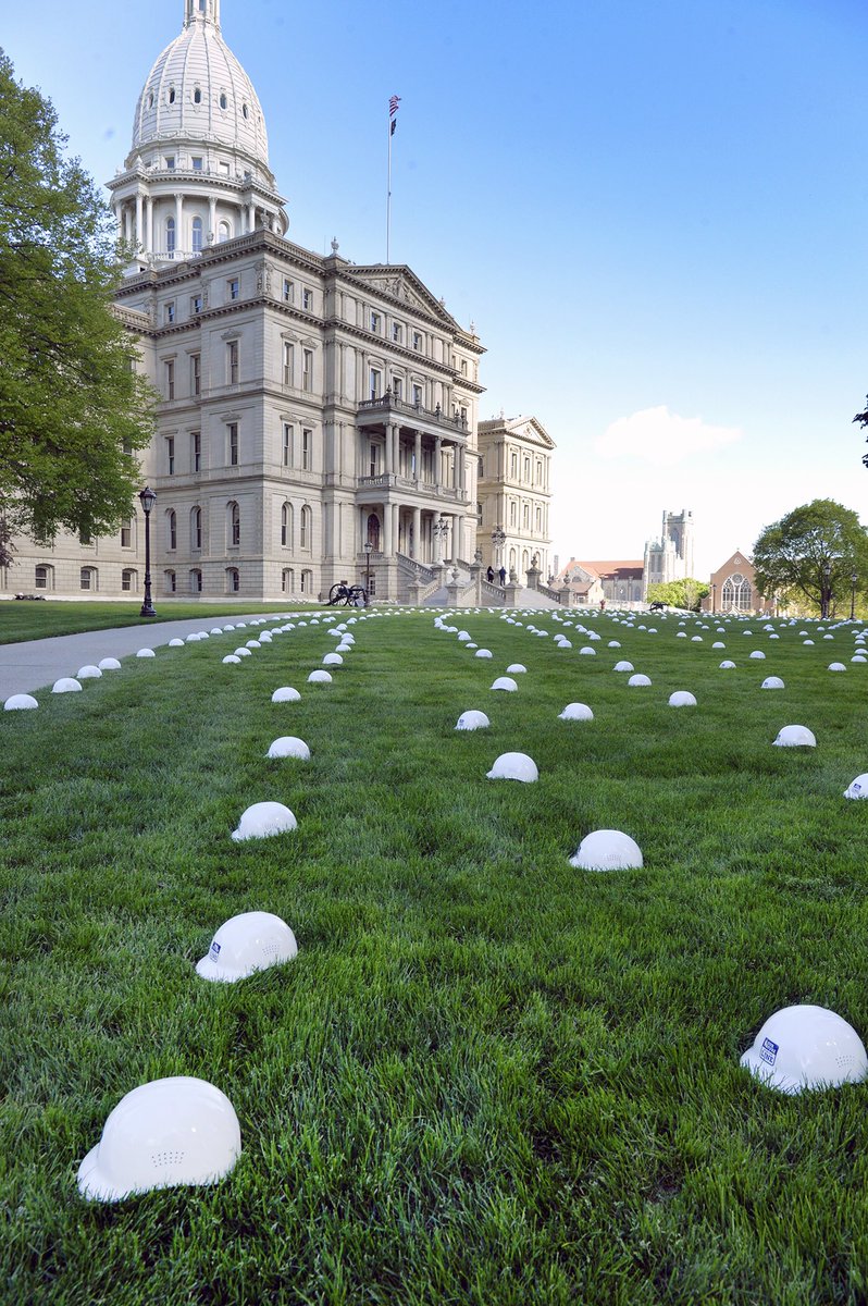 Today, 1,200 hard hats were displayed on the Capitol lawn in Lansing. Each hat represented a steelworker that would be out of work if