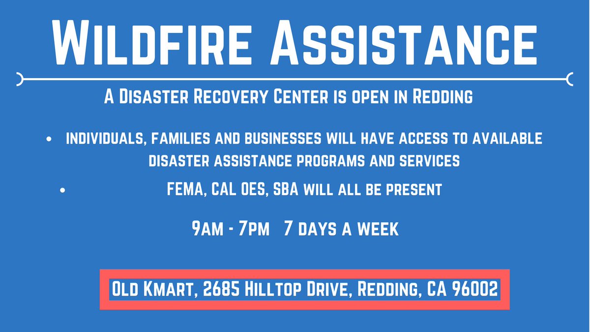 There is a disaster recovery center in Redding for those affected by recent wildfires. Representatives from FEMA, CAL OES and SBA will be present to provide access to disaster assistance programs.pic.twitter.com/ZSu78zHdPL