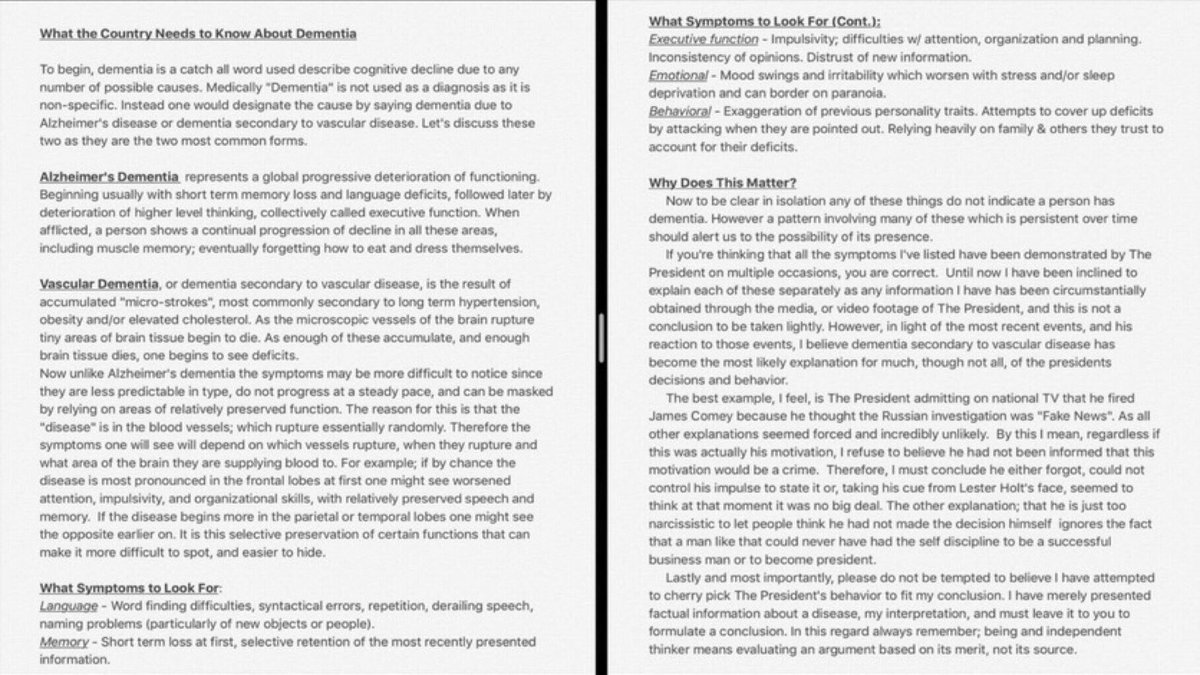 In light of The NY Times article and its mention of the 25th amendment I think it’s time to repost this. It’s important because his behavior could actually be related to early signs of dementia not just him being an idiot. #25thAmendment #25thAmendmentNowhttps://twitter.com/splinter_news/status/877185452175876098?s=21 …