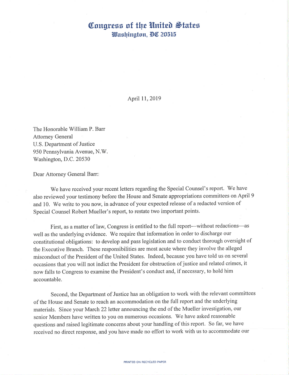 Congress must receive the full, unredacted Mueller report and the underlying evidence in order for us to carry out our constitutional duties. A redacted version filtered by AG Barr is insufficient. The DOJ has long provided unredacted materials about investigations to Congress.pic.twitter.com/vEy2psqplk