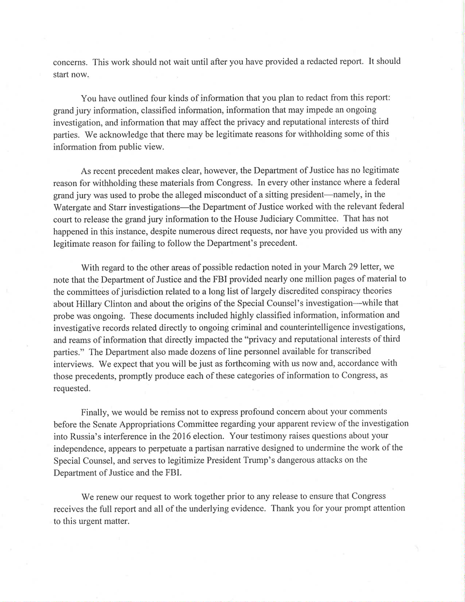 Barr’s unsolicited memo outlining his view that presidents cannot obstruct justice and his recent, unsubstantiated claims of FBI “spying” on the Trump campaign are deeply concerning and show why Congress must see the full report.
