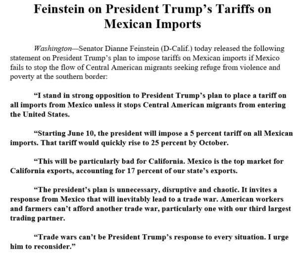 I strongly oppose President Trump’s plan to place a tariff on all imports from Mexico unless it stops migrants from entering the U.S. This will be particularly bad for California. Mexico is the top market for California exports, accounting for 17% of our state’s exports.