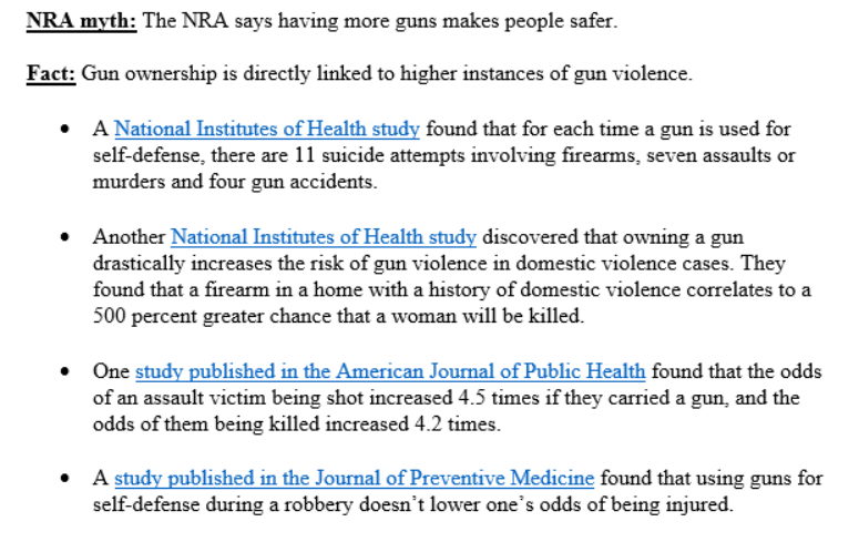 The mission of the NRA seems to center on boosting the profits of gun manufacturers, so it’s no surprise that they want as many guns as possible on our streets. But more guns don’t make us safer. More guns means more deaths, accidents and suicides.