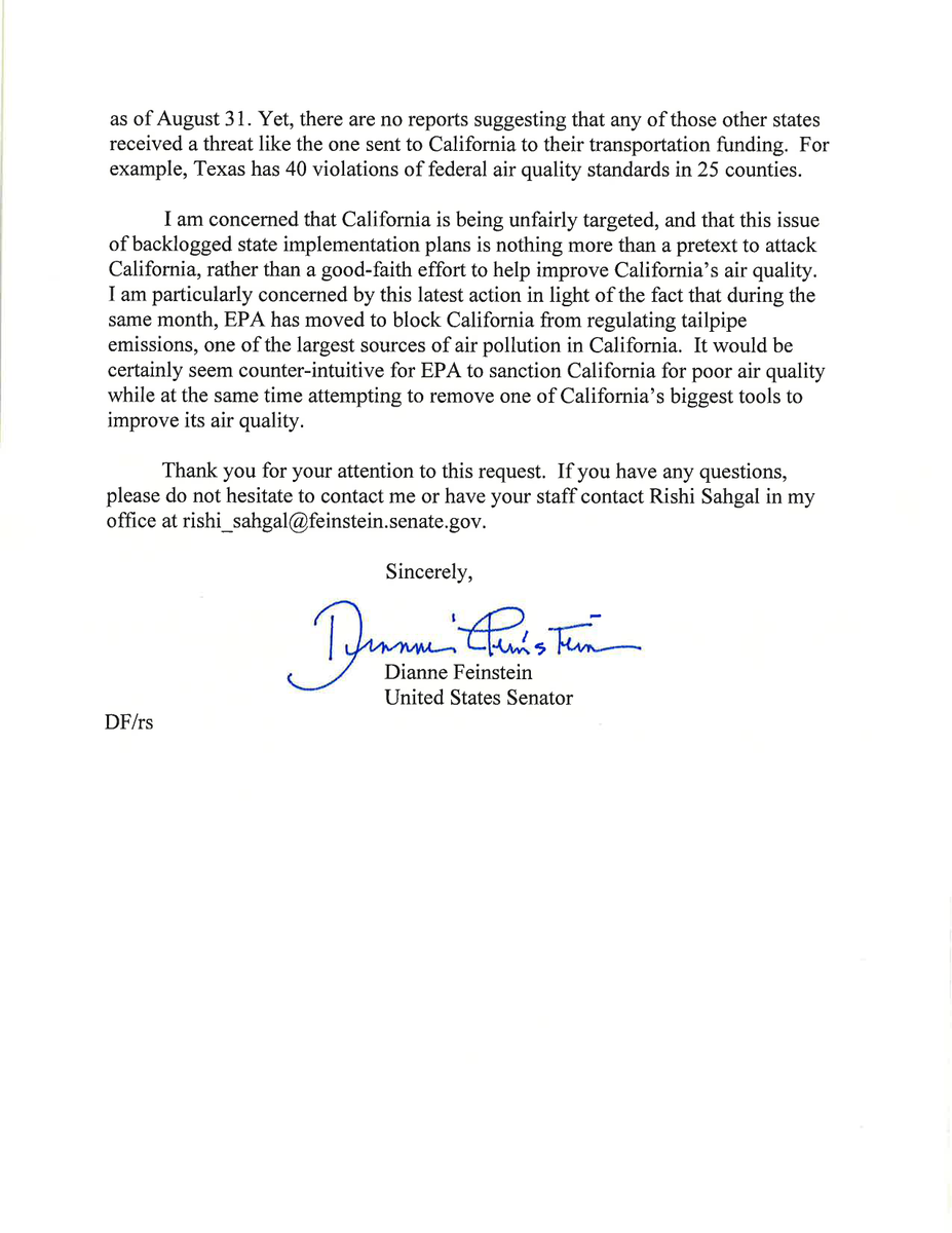 The charitable tone of this message is offensive considering the urgency the issue demands. The malevolence and spite of the Trump EPA is plain disgusting, and Sen Feinstein should tell them so in no uncertain terms.