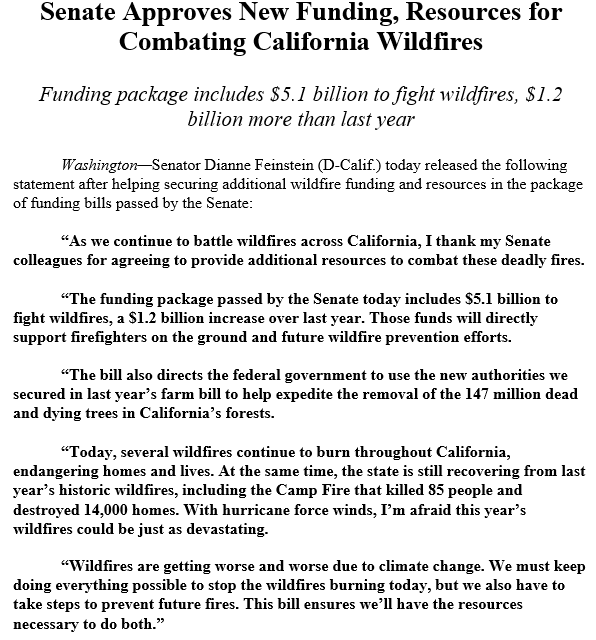 As we battle wildfires across California, I thank my Senate colleagues for agreeing to provide additional resources. The funding package passed by the Senate yesterday includes $5.1 billion to fight wildfires, a $1.2 billion increase over last year.