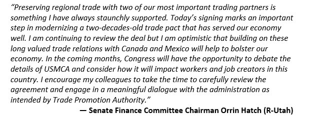 .@senorrinhatch on #USMCA signing: "Today’s signing marks an important step in modernizing a two-decades-old trade pact that has served our economy well." https://go.usa.gov/xPMbm pic.twitter.com/hXSL5fIXTy