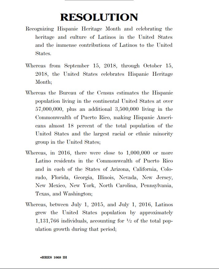 Proud to help introduce this year’s #HispanicHeritageMonth House Resolution to celebrate the immense contributions, culture, and heritage of the Hispanic community in America.pic.twitter.com/j7fVTf3vi6