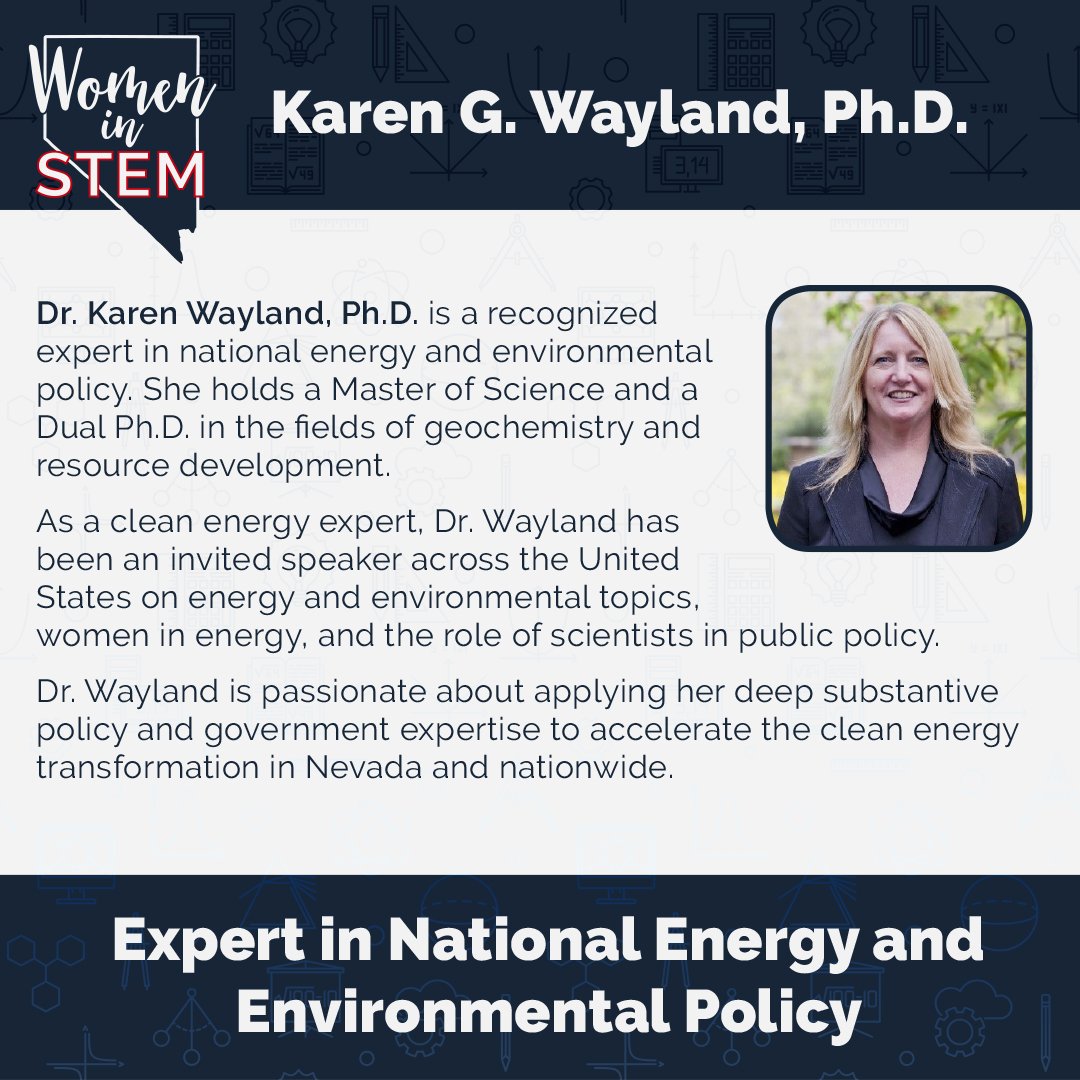 Dr. Karen Wayland has a Ph.D. in geochemistry and resource development and is a recognized expert in energy and environmental policy-- she’s also this month’s #NevadaWomenInSTEM! Thank you, Dr. Wayland, for being a Nevada clean energy champion!pic.twitter.com/l1IY7vwJJi