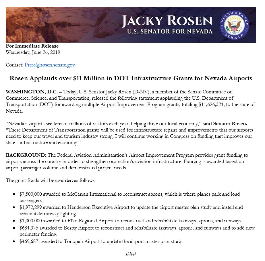 Glad to see @USDOT award grants totaling over $11 million dollars to Nevada to strengthen our critical aviation infrastructure. I’ll continue working in Congress on funding that improves our state’s infrastructure and economy.pic.twitter.com/mtTpFCUHNF