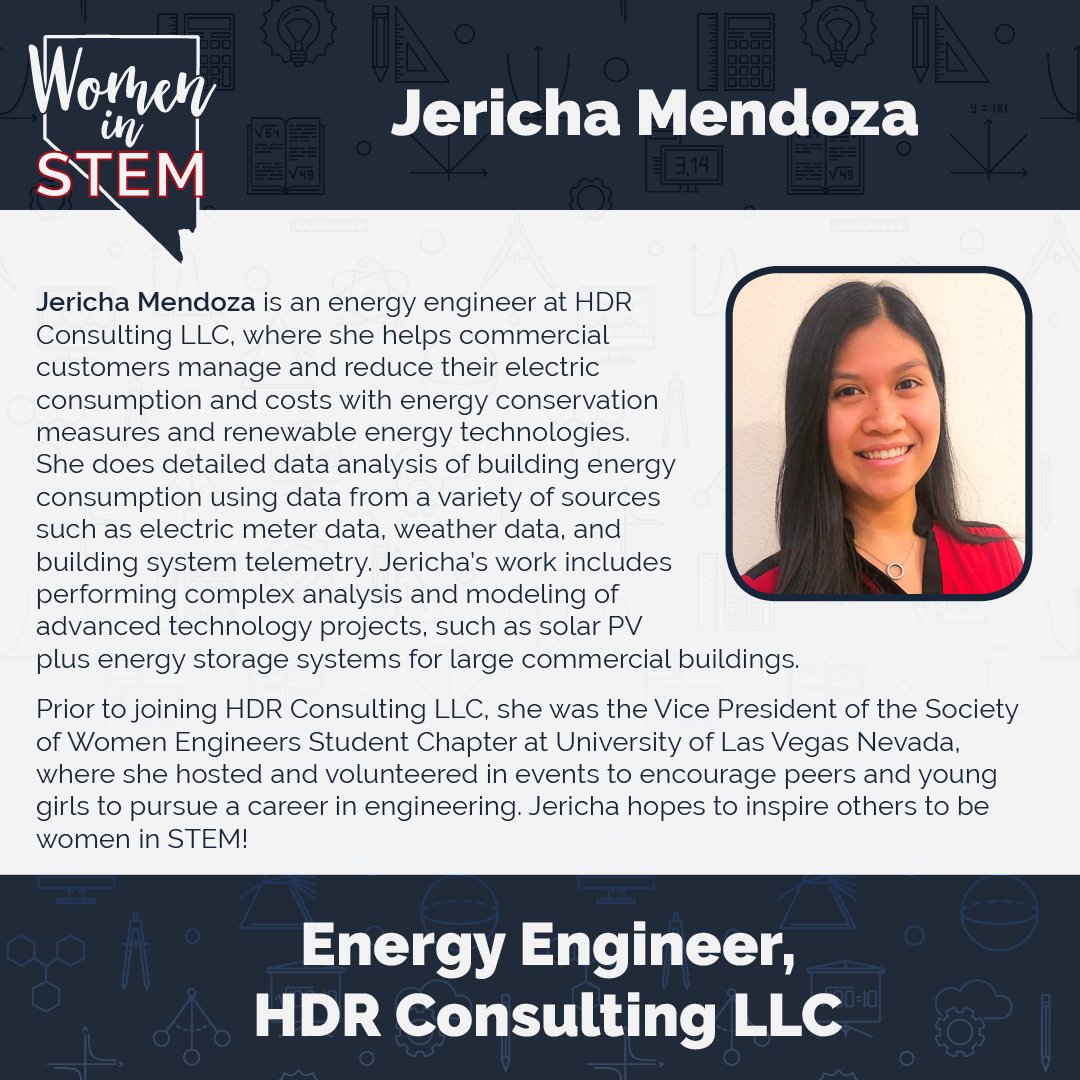 Introducing October’s Woman in STEM: Jericha Mendoza! Jericha is an energy engineer and works to help companies reduce their energy consumption. She is a proud Woman in STEM and hopes to inspire other women in Nevada and across the country to pursue STEM careers.pic.twitter.com/ItgbXFkHXU