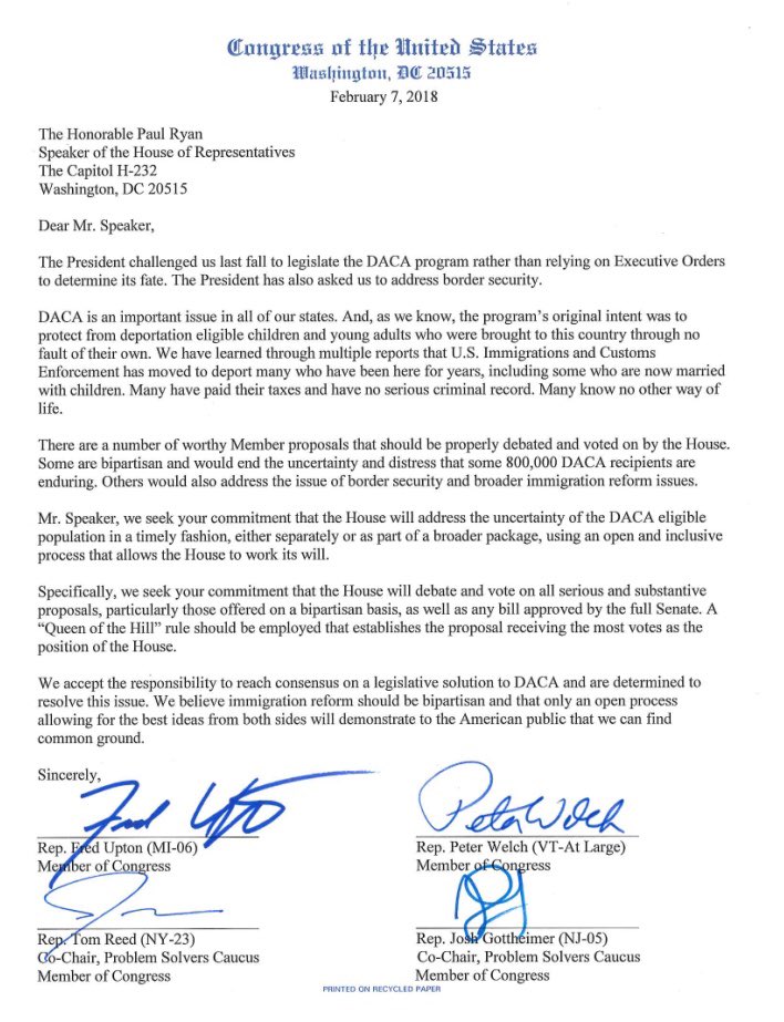 La semana pasada, mis colegas de ambos partidos y yo enviamos una carta a @SpeakerRyan urgiéndole que abra el pleno de la Cámara a un debate y permita un voto sobre las propuestas que corrigen la crisis fabricada de DACA antes de la fecha límite arbitraria del 5 de marzo.pic.twitter.com/0ArdgZ35nZ