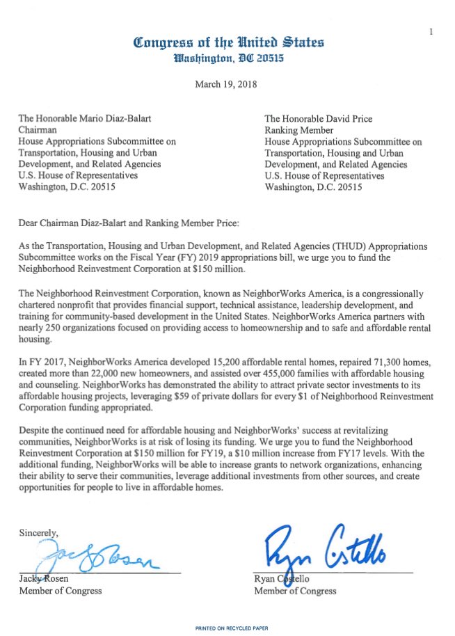 I’ve sent a letter to House appropriators urging them to include robust funding in the FY19 appropriations bill for NeighborWorks America. Las Vegas has a growing need for affordable housing and we need to address this now.pic.twitter.com/zyAritQbvo