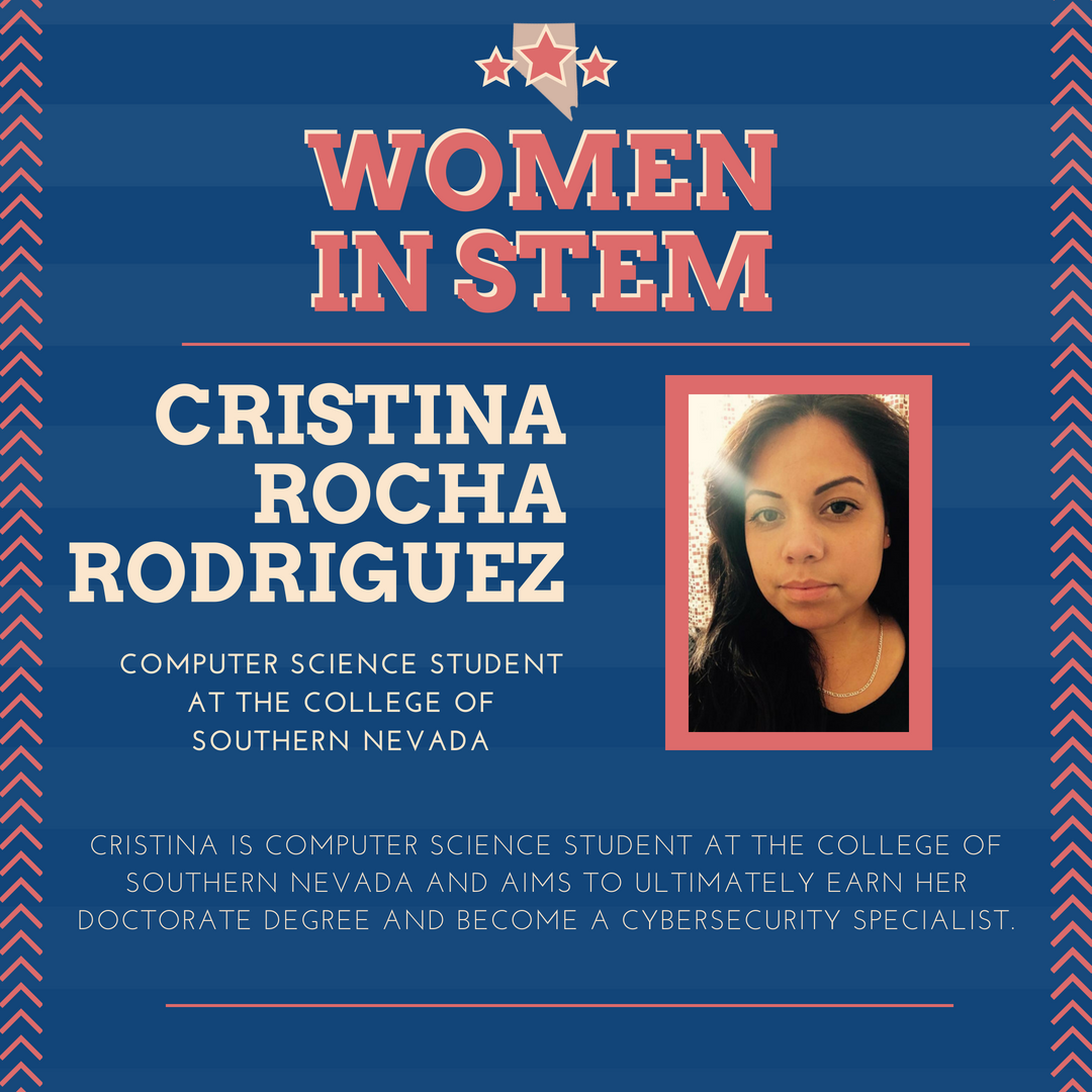Congrats to this month’s #NevadaWomanInSTEM, Cristina Rocha Rodriguez! She is currently a student at @CSNCoyote & aims to earn her doctorate degree to become a cybersecurity specialist. Keep up the great work!pic.twitter.com/eULbdjuK2C