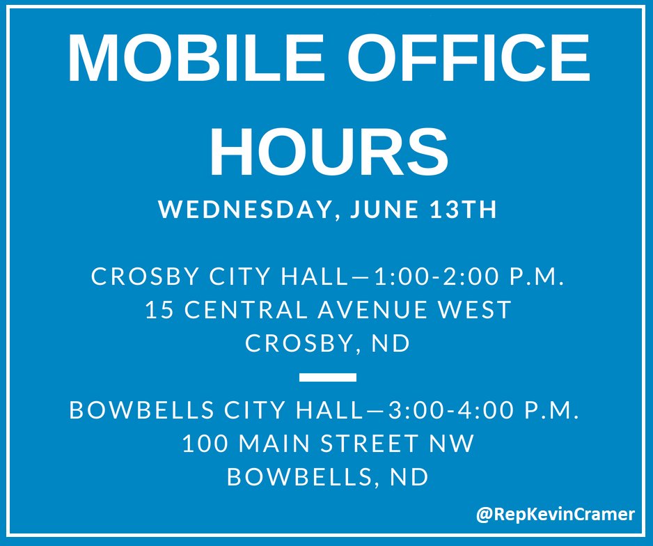 For assistance with casework from my staff in the Crosby and Bowbells areas, stop by the mobile office hours tomorrow. Details below ↓pic.twitter.com/ncOyRAqcAW