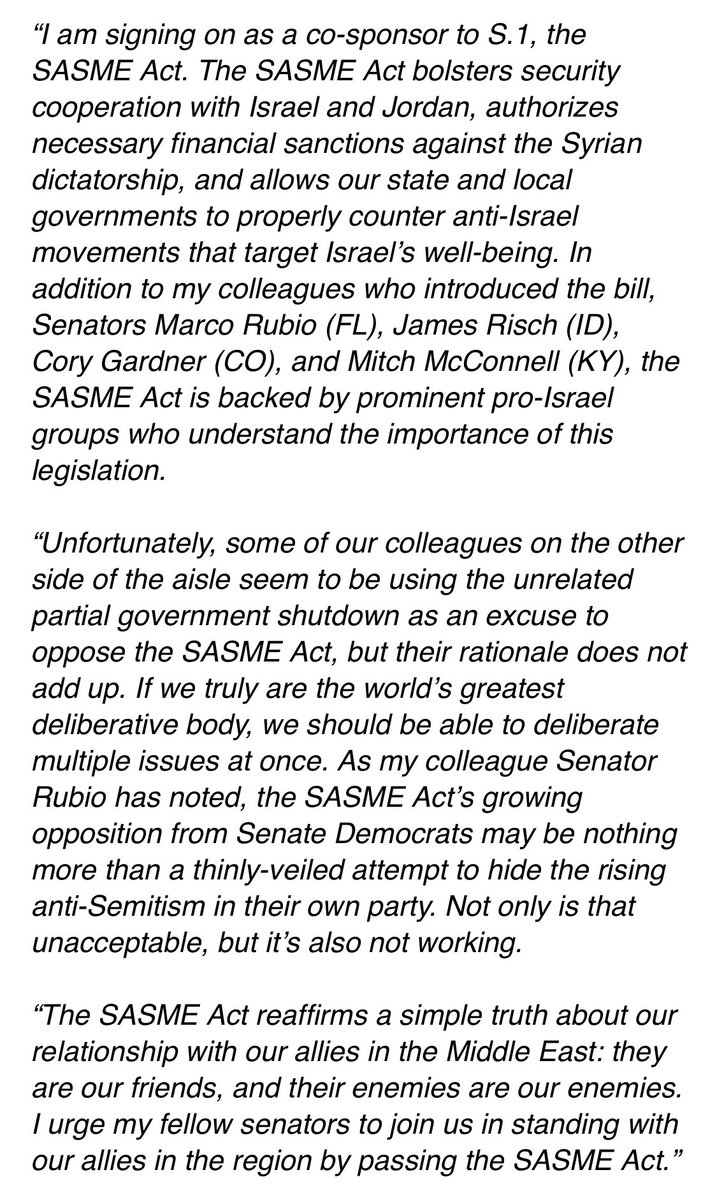 I am signing on as a co-sponsor to S.1, the SASME Act. This bolsters security cooperation with Israel and Jordan, authorizes sanctions against the Syrian dictatorship, and allows our state and local governments to properly counter anti-Israel movements. My statement—>pic.twitter.com/XmKDxMAnMO