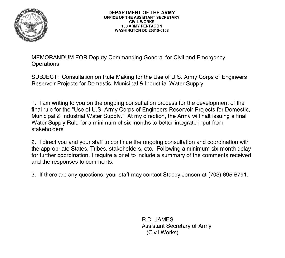 The Army Corps of Engineers will halt their final Water Supply Rule from being issued for at least six months in order to better integrate input from stakeholders. This is a major victory. The Corps’ preferred rule ignores both precedent and statute.pic.twitter.com/fky5LCIhn4