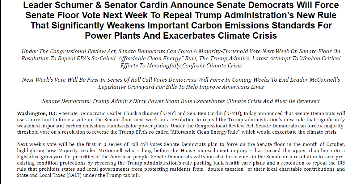 NEW: Senate Dems will force a Senate floor vote next week to repeal Trump admin rule that curtails carbon emissions standards for power plants. They'll use the Congressional Review Act to spur a vote that puts all senators on record on the issue pic.twitter.com/W65LS6dtZ7