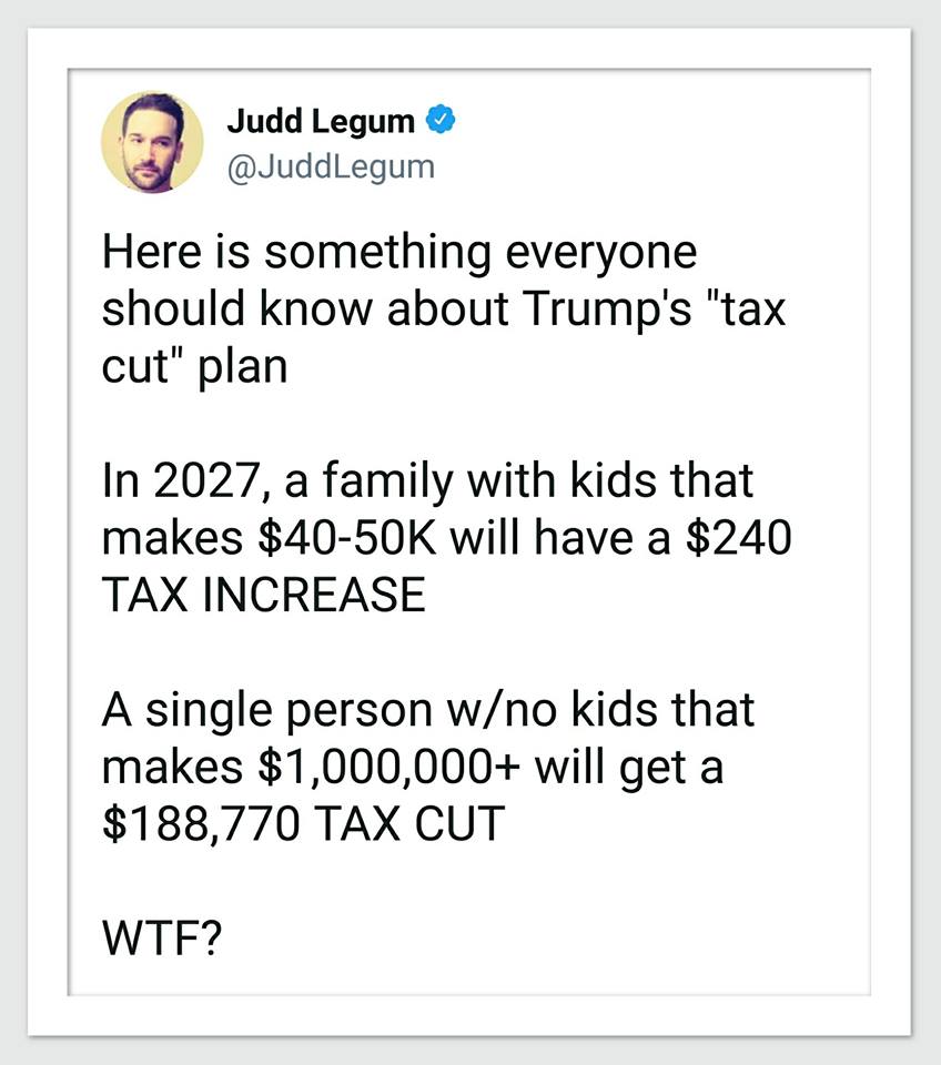 “The tax bill Senate Republicans are championing would give large tax cuts to millionaires while raising taxes on American families earning $10,000 to $75,000https://politicalwire.com/2017/11/16/tax-bill-slam-families-earning-less-75k/ …