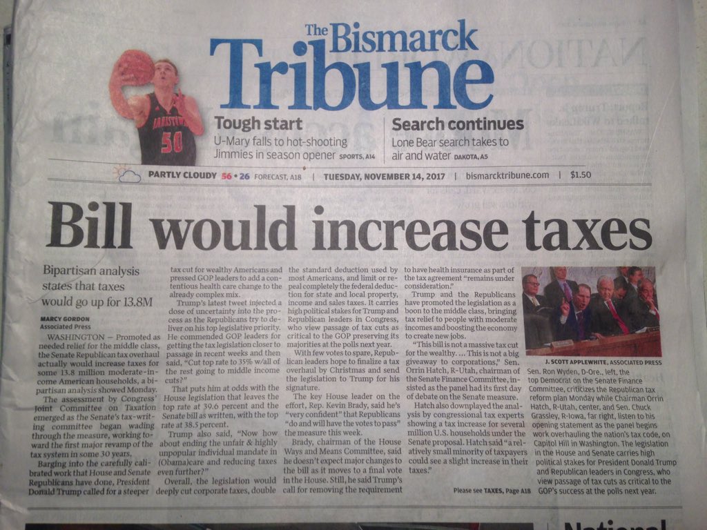 The @AP disagrees. It was in the Bismarck Tribune this week. https://www.apnews.com/70f3855dbe734fdd8a3bb00f8daaa15f/Bipartisan-analysis:-Senate-bill-would-hike-taxes-for-13.8M?utm_campaign=SocialFlow&utm_source=Twitter&utm_medium=AP_Politics … What are your thoughts on #TrumpRussia ?pic.twitter.com/ZD0NiKCVZP