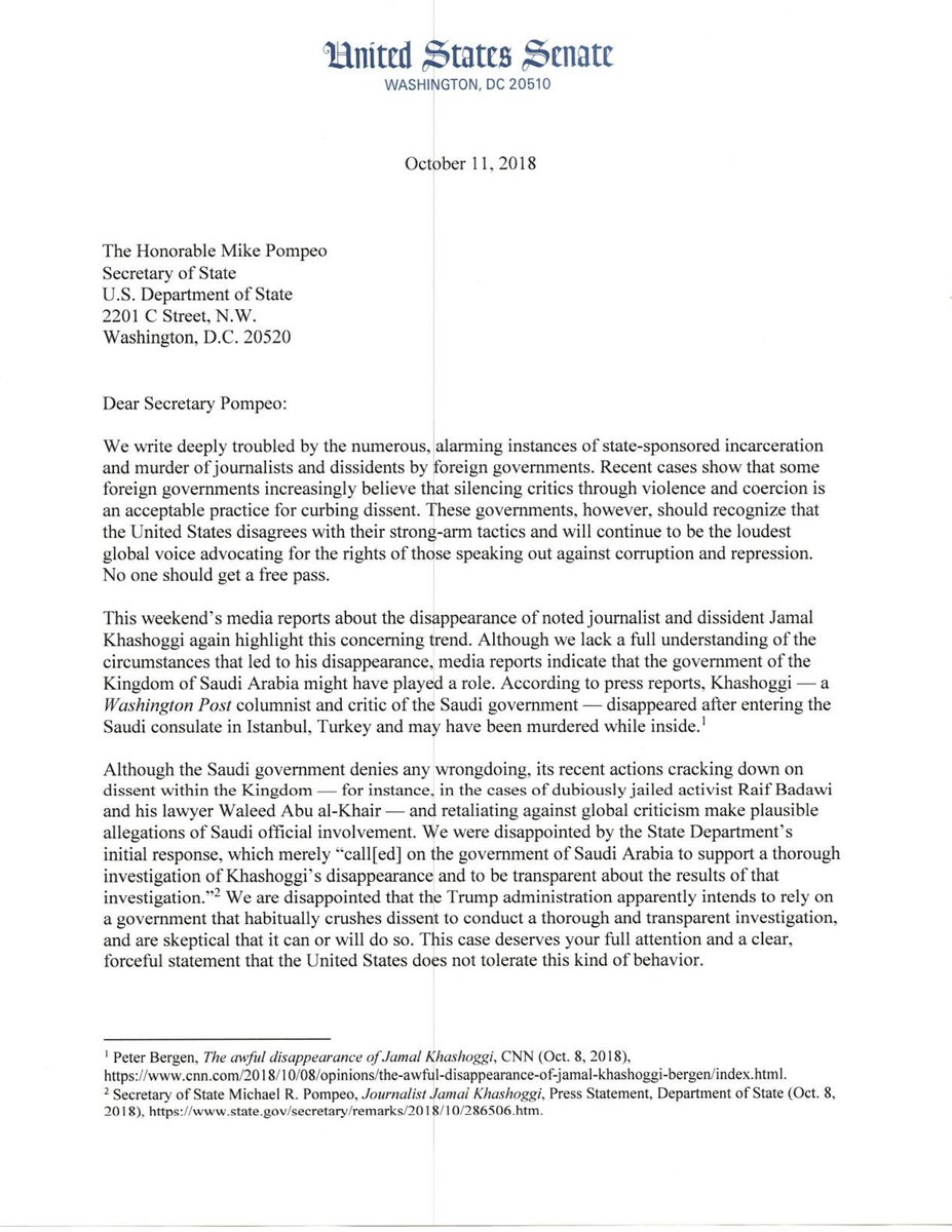 So far in 2018, 43 journalists have been murdered. #Khashoggi’s disappearance highlights a disturbing trend of authoritarians increasingly silencing critics with violence. I’m leading 22 of my colleagues in urging Pompeo to use every tool to defend freedom of expression globally.pic.twitter.com/anbh5o9NSN