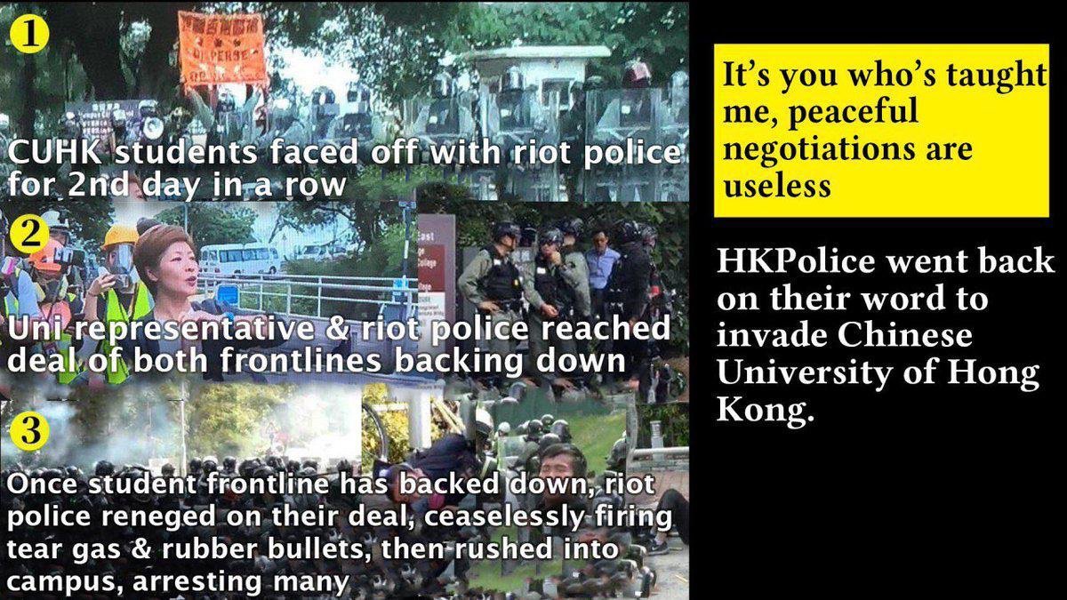 “CUHK is now being suppressed. If we don’t resist now, we can never resist,” said a black bloc CUHk student. #antielab #hongkongprotests pic.twitter.com/U6jVtDbZut