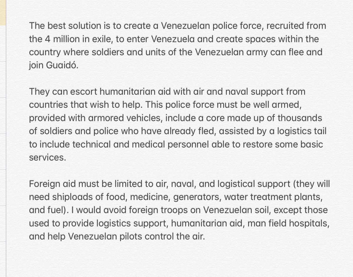 Repeat this 10X: "We must help Venezuelan nationals who fled their country create a strong police force to stabilize their country, help distribute humanitarian aid, and protect the thousands of technicians and professionals who will be returning to fix infrastructure"