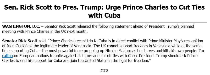 El reciente viaje del príncipe Carlos a Cuba está en conflicto con el reconocimiento de @PrimeMinisterTM de @jguaido como legítimo líder de #VZ. @POTUS debe pedirle al Príncipe en su reunión que corte su apoyo a Cuba y se una a los EE.UU. en la lucha por libertad. Declaración ⬇️pic.twitter.com/KLu6vt3kAG