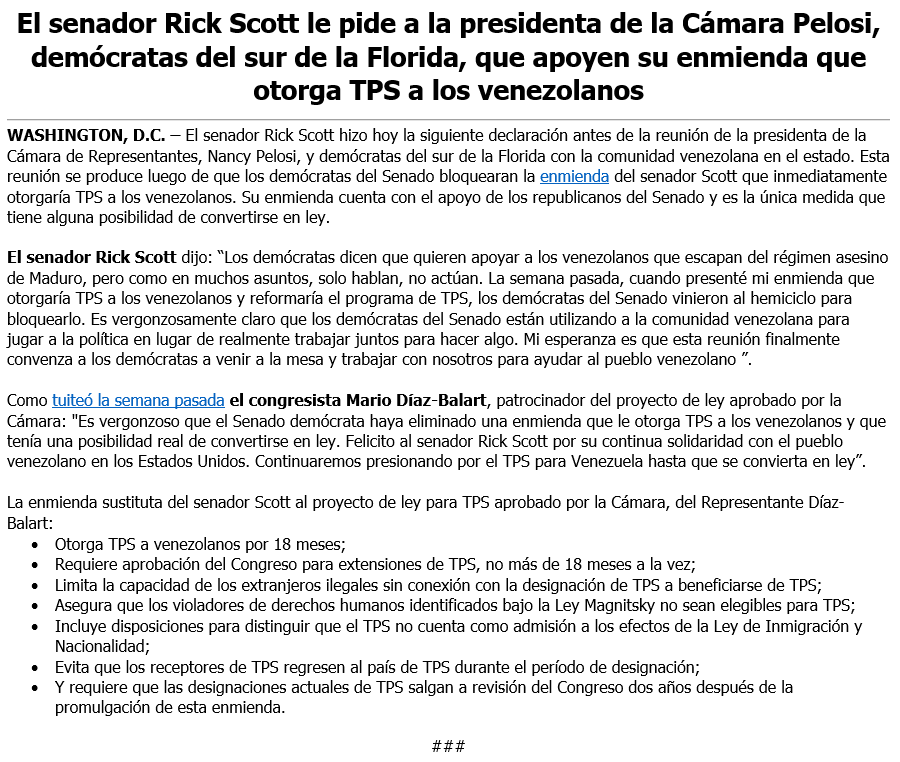 Last week, Senate Dems blocked my amendment to help Venezuelans escaping Maduro’s ruthless regime. They’re all talk, no action. @SpeakerPelosi and South FL Dems should support my TPS Amendment to help the Venezuelan community. It’s the only measure that can become law.pic.twitter.com/Nrc4rFML2i