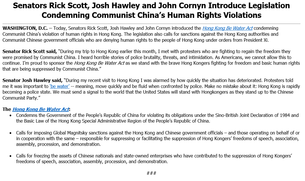 I’m proud to sponsor the Hong Kong Be Water Act with @HawleyMO & @JohnCornyn to fight the brutality, threats & intimidation. As Americans, we can't allow this to continue. We must stand with the brave Hong Kongers fighting for human rights being suppressed by Communist China.pic.twitter.com/UFQ5EwgGIx