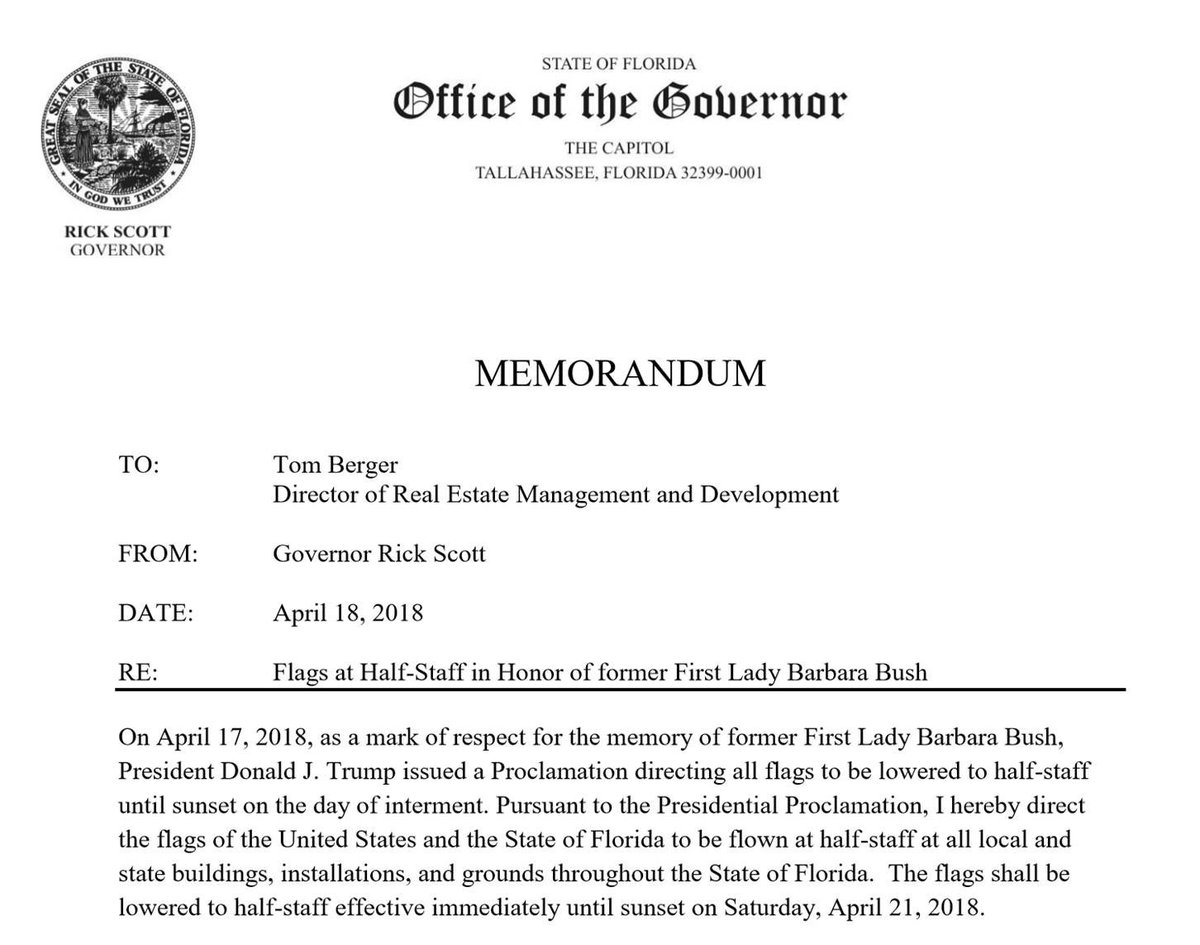 Flags in FL will be flown at half staff in honor and memory of Former First Lady Barbara Bush.https://bit.ly/2vwbB34 pic.twitter.com/KgqZP0JqSS