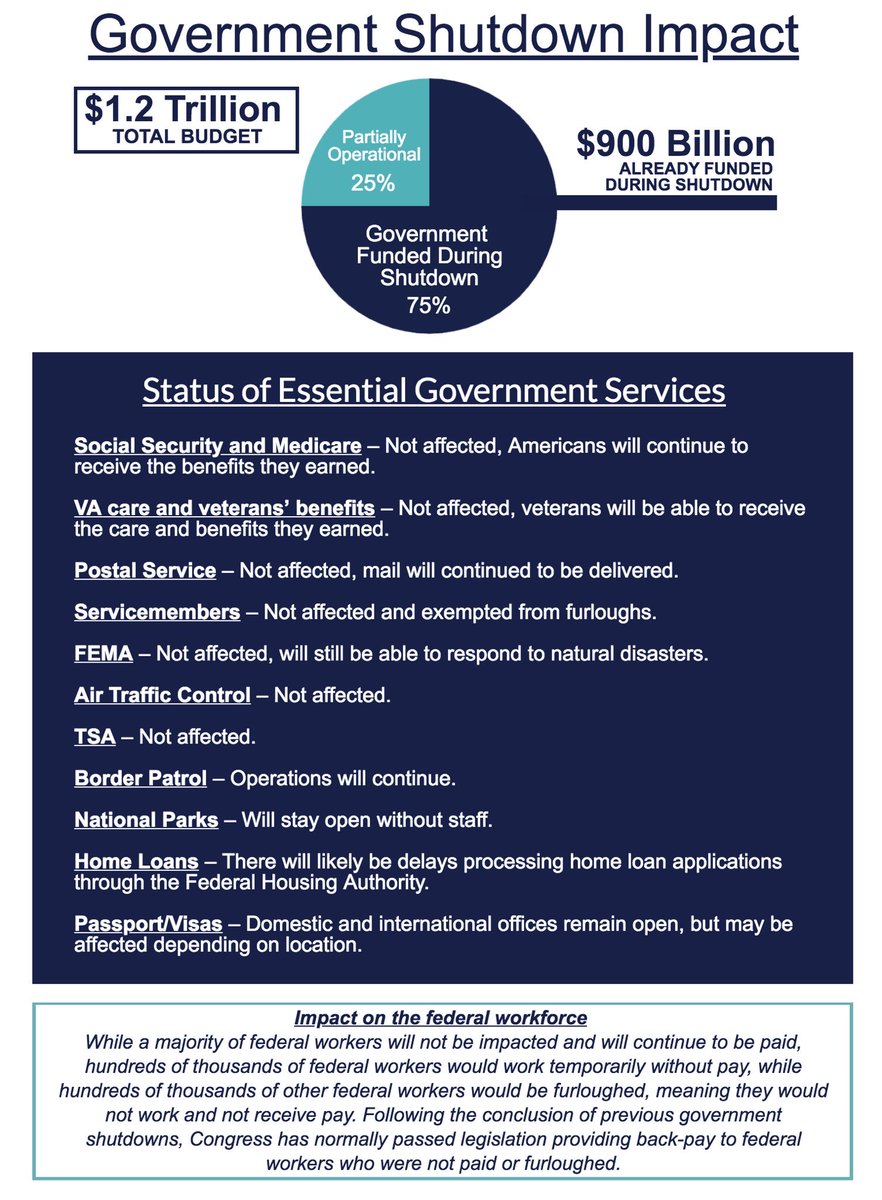 During the partial government shutdown, many essential government services will not be affected such as Social Security, Medicare, and veterans’ benefits.pic.twitter.com/EpMA7wfHJc