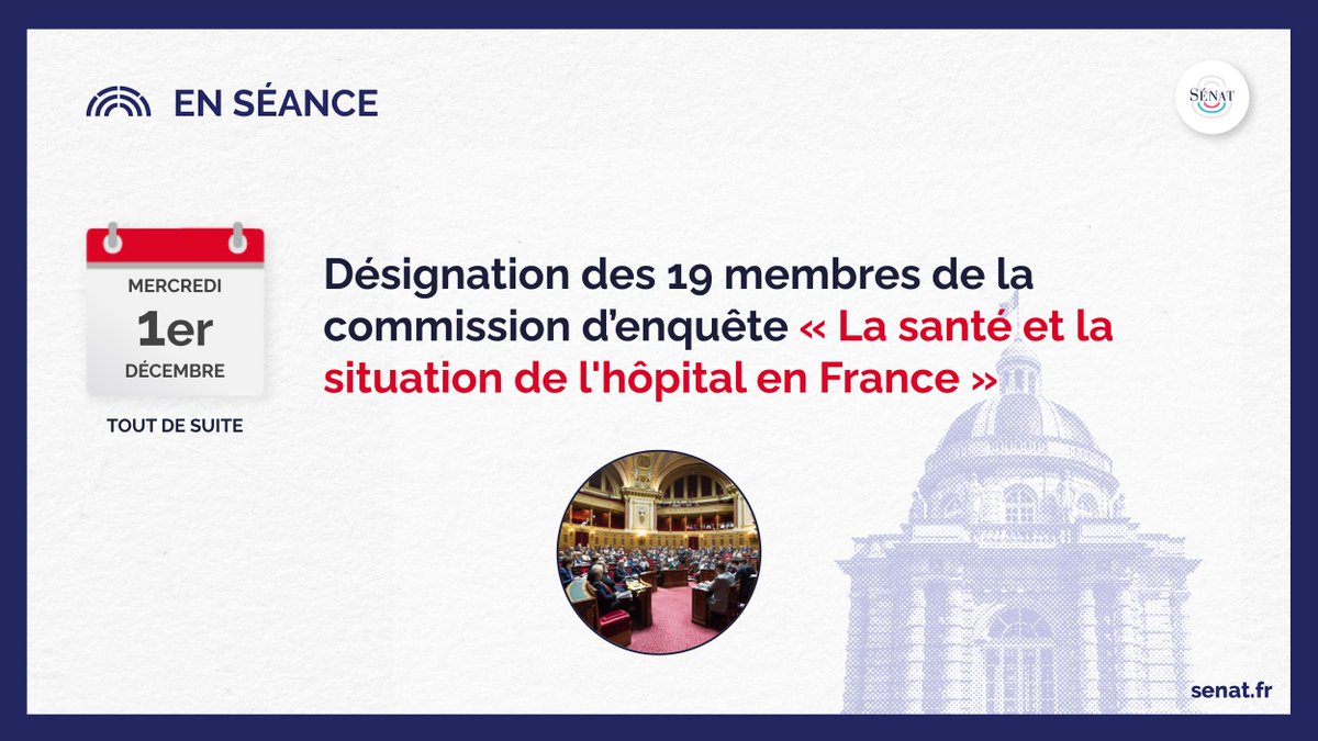 Tout de suite, suivez en direct, sur le site du Sénat, la désignation des 19 membres de la commission d’enquête "La santé et la situation de l'hôpital en France".
