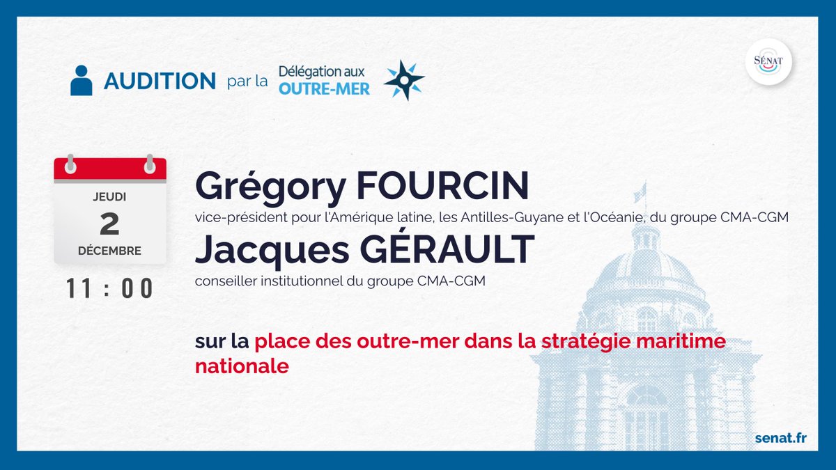 À 9h30, suivez en direct, sur le site du Sénat, les auditions sur la place des #OutreMer dans la stratégie maritime nationale, organisées par la délégation#OutremerSénat. Le direct :